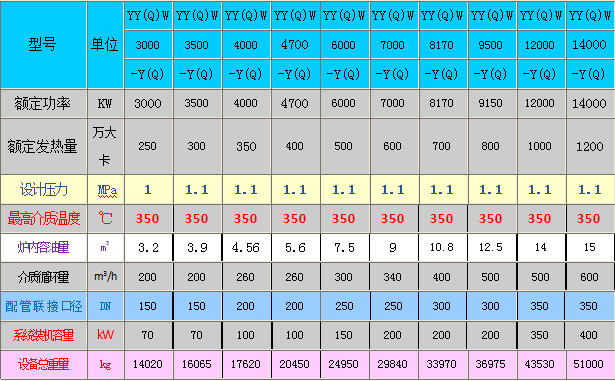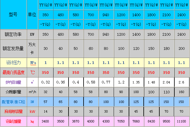 YY(Q)W 15~200 ×104kcal/h燃气导热油锅炉型号规格参数表