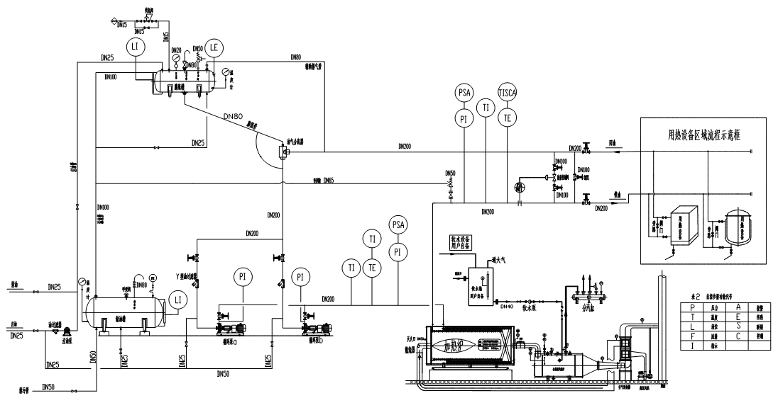 在以上原理框图中:有机热载体是由循环泵输出—→低氮燃气导热油锅炉—→热用户(即用热设备)—→油气分离器—→再进入循环油泵。这是一个循环管路,原理图中是用粗黑线表示出来的,是主循环管路。在正常供热时,有机热载体就是沿着这样一个环形循环管路,不断循环流动,将热能从有机热载体炉送到用热设备。其他部分如膨胀槽、储油槽、注油泵等都是不可缺少的辅助设备,正常供热时,它们都不参与有机热载体的循环流动,但是它们在整个供热管路中起着重要作用,是不可缺少的。