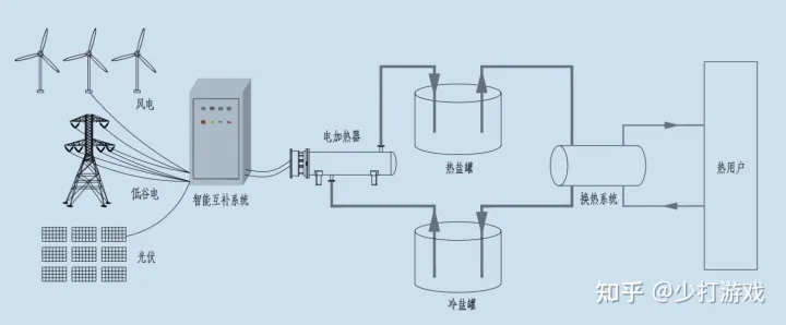 蓄热过程:采用智能互补系统将风电,光伏、夜间低谷电作为加热熔盐的能源,通过加热熔盐存储可再生能源或低谷电能。